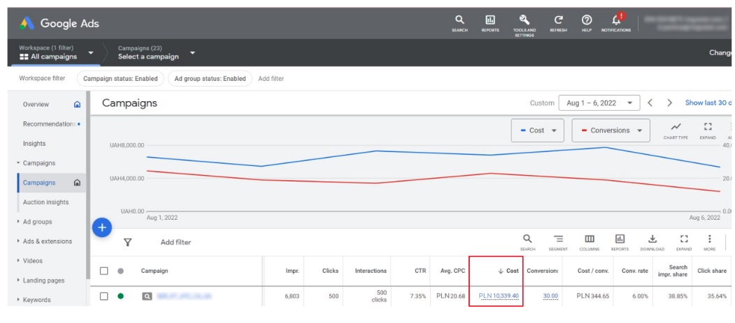 - Dane o wydatkach pobieramy z systemów reklamowych, w których prowadzisz kampanie. Na przykład Google Ads a Facebook Ads. Trzeba też doliczyć koszty serwisów i usług specjalistów zewnętrznych itp. Jeśli chodzi o reklamę internetową, to koszty można łatwo znaleźć w Google Ads, w zakładce "Kampanie" i w kolumnie poświęconej kosztom.