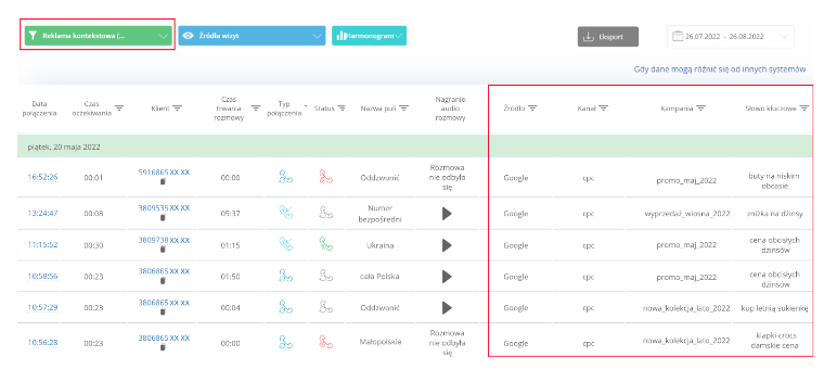 - wyciągnie statystyki dotyczące źródeł połączeń z call trackingu, jeśli go używasz;